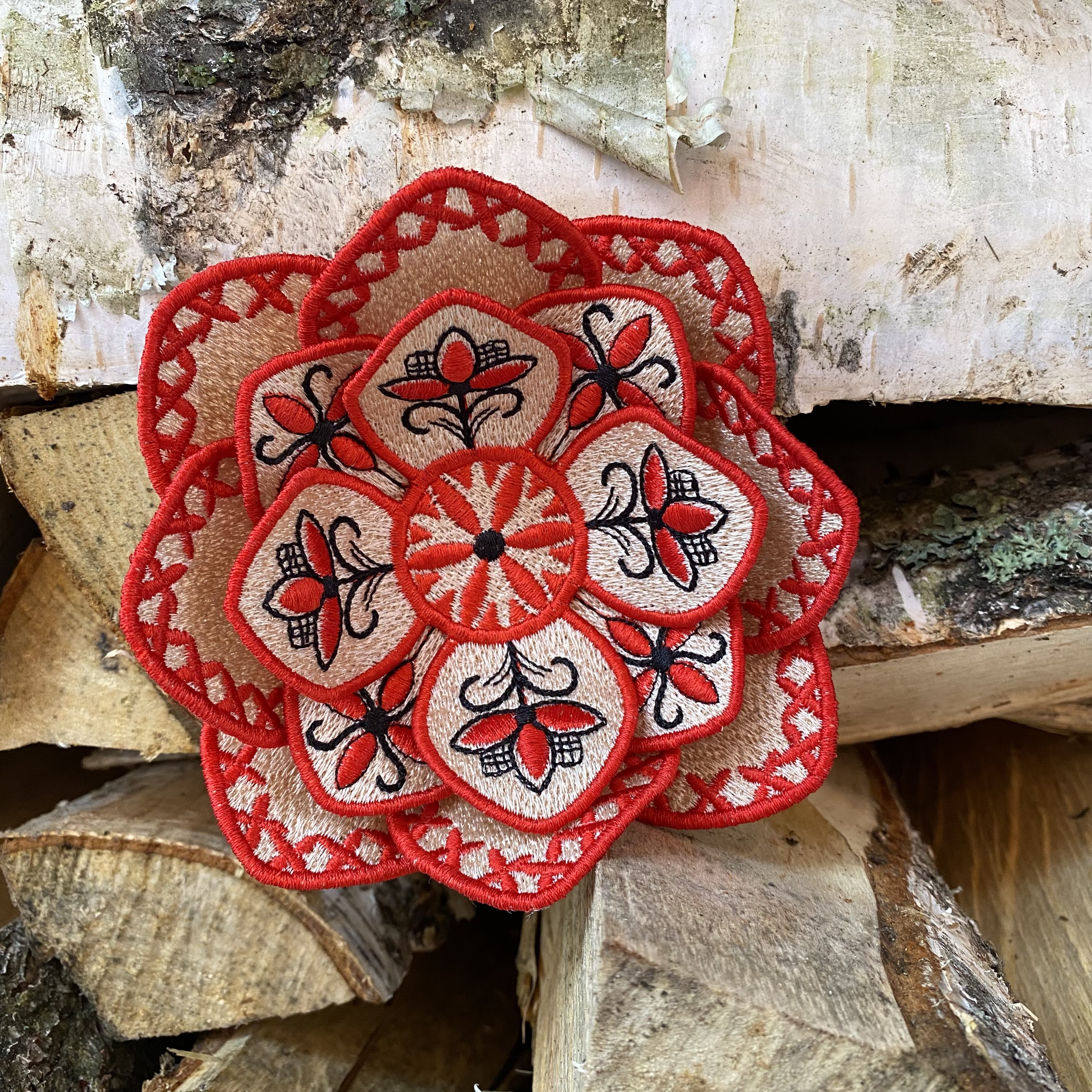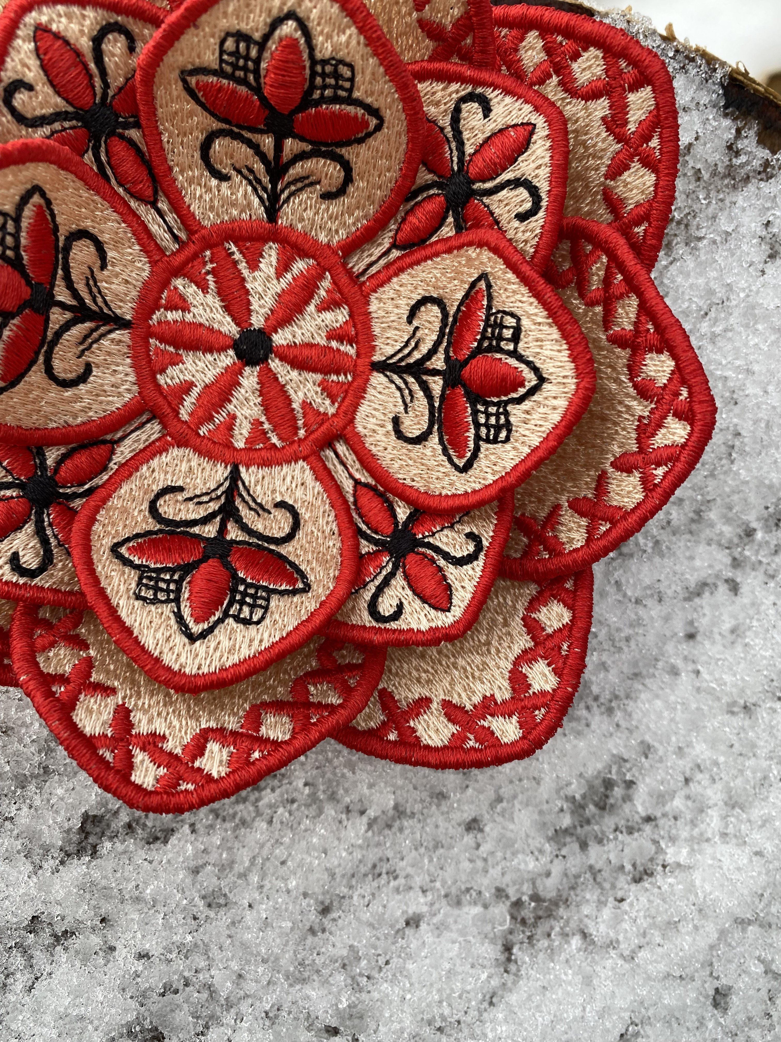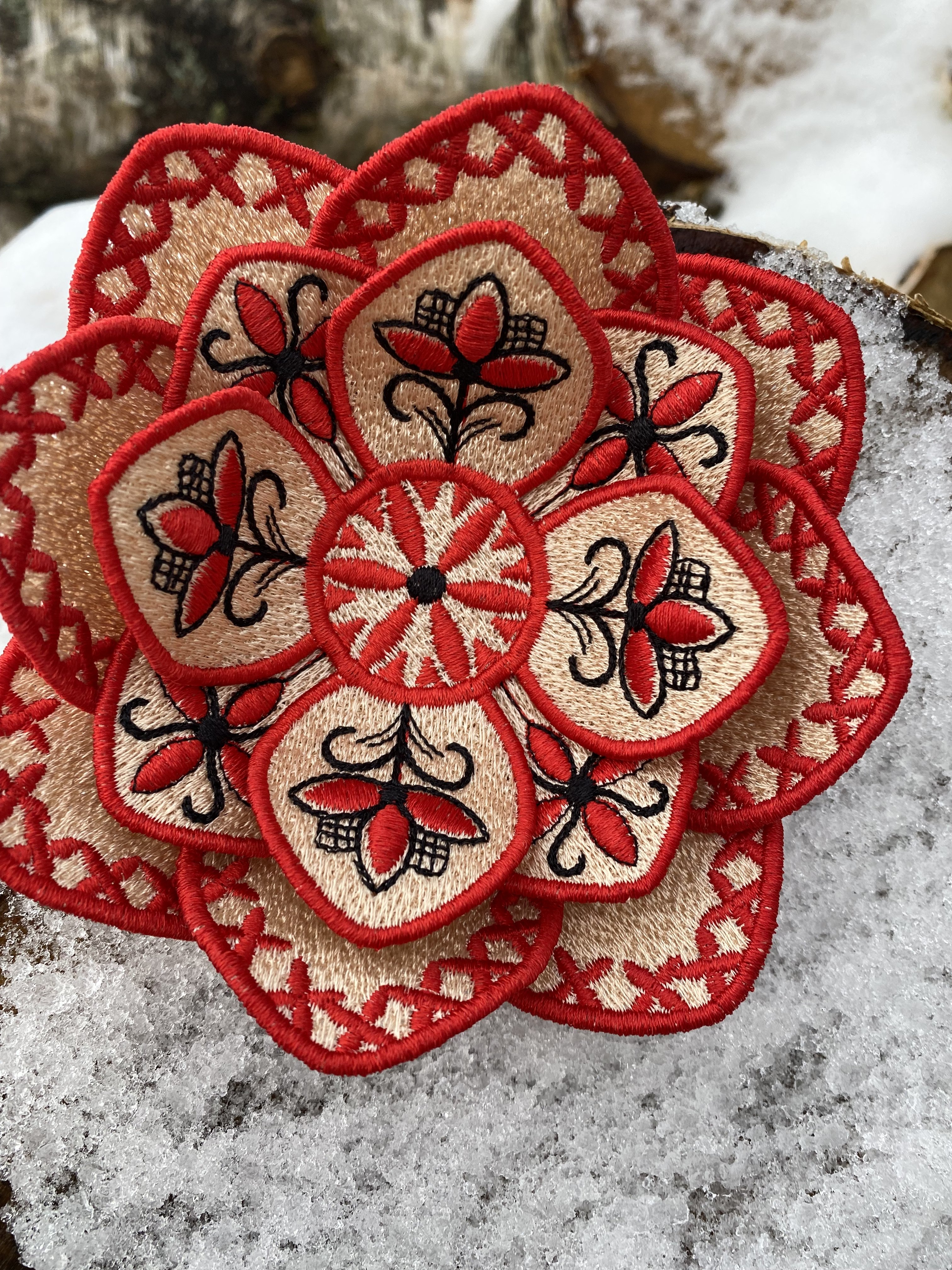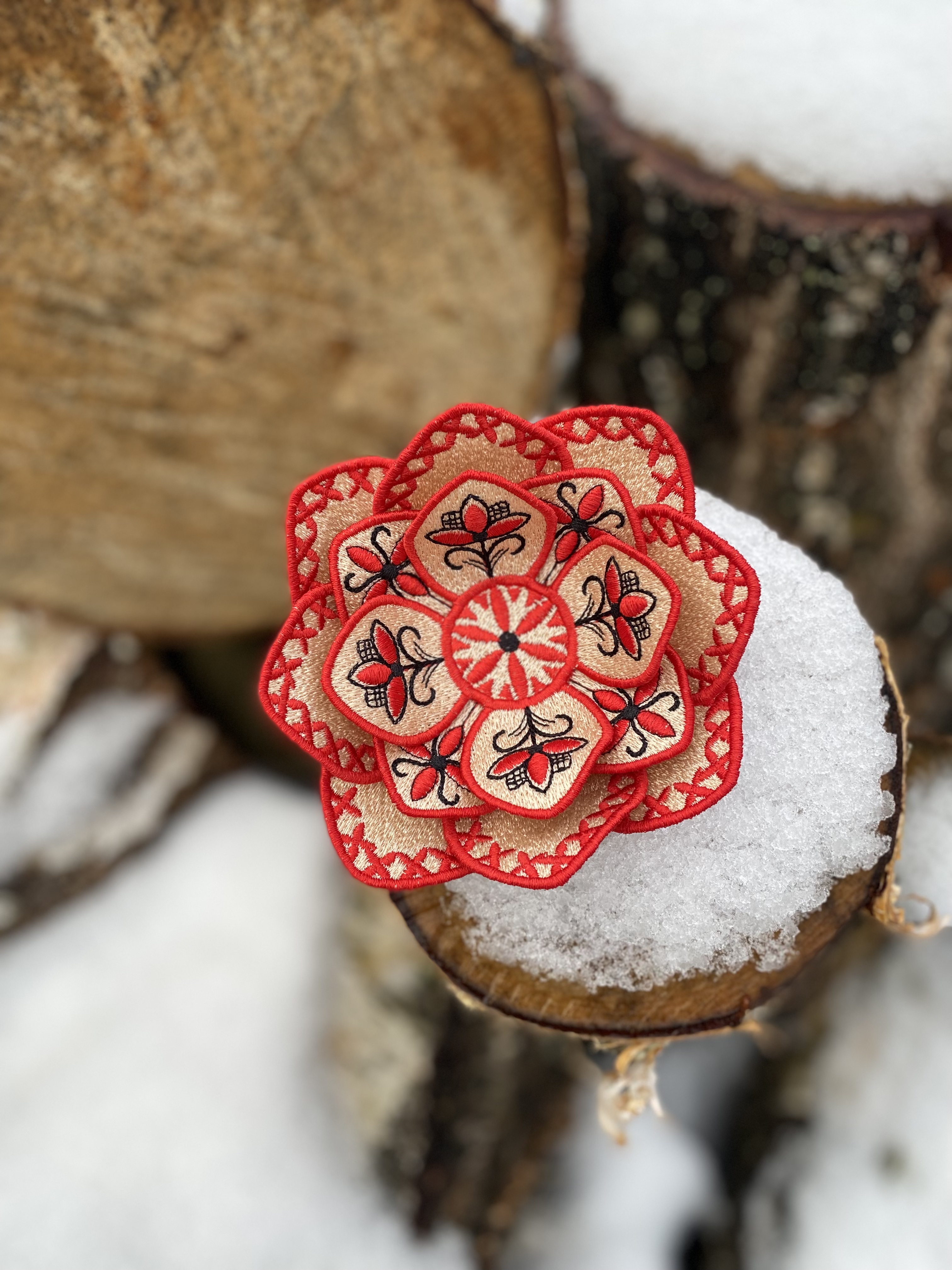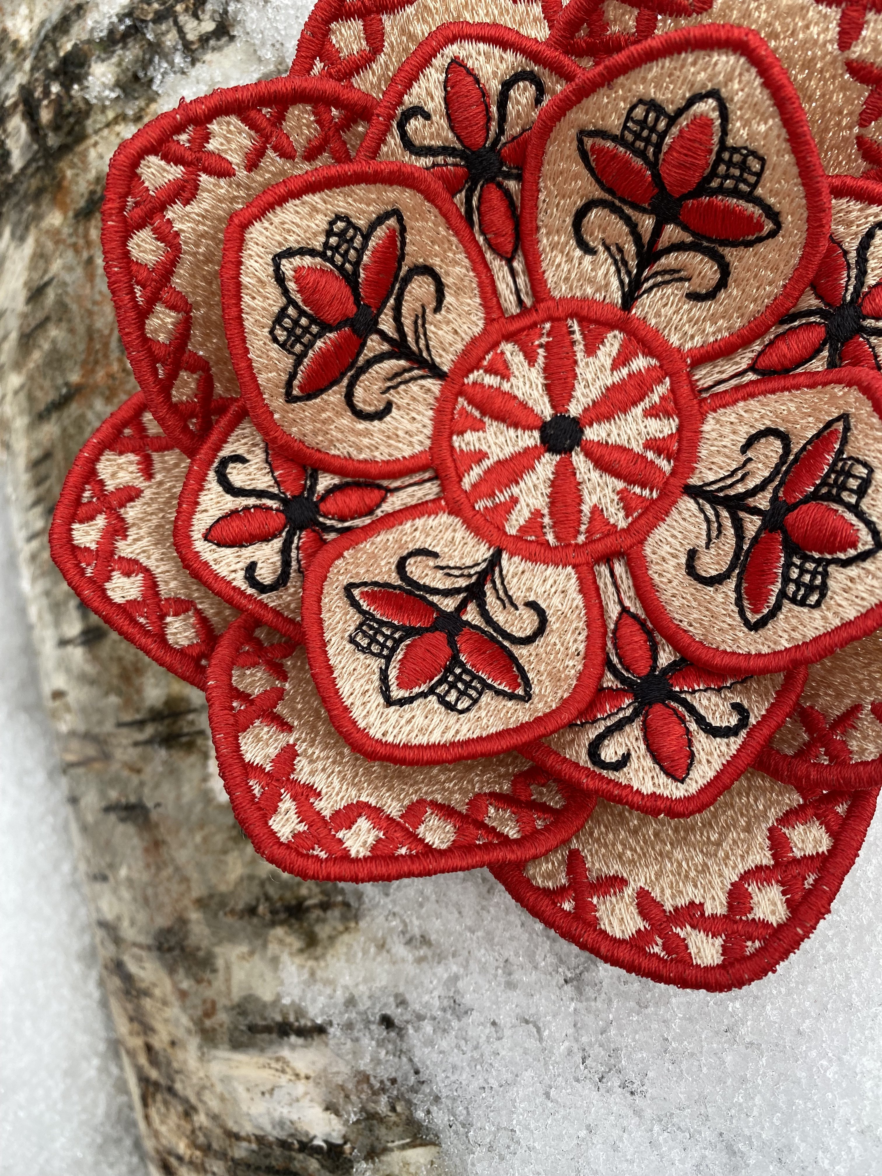 Fantasy flower brooch by FSL in the Mezen painting style, machine embroidery design