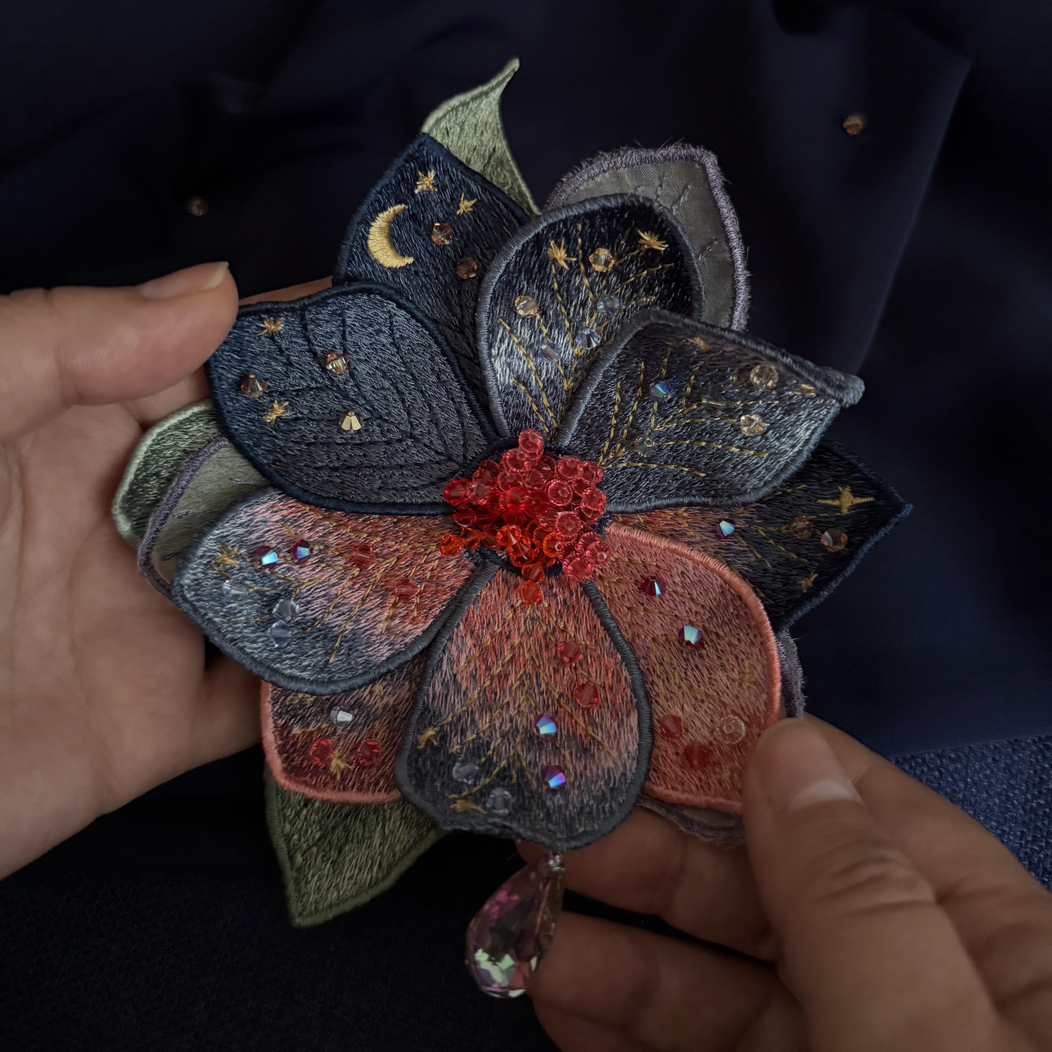 Fantasy flower brooch design using the FSL technique, "Kiss of Dawn." This flower doesn't exist in nature, but it can bloom in your hands. The flower symbolizes the beginning of a bright dawn after a dark night.