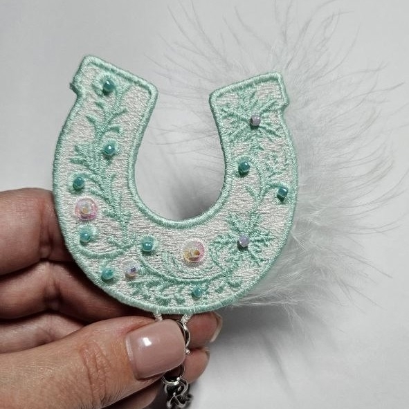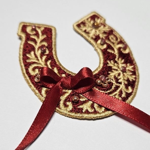 Machine embroidery horseshoe pendant for creating Christmas tree ornaments and other decor.